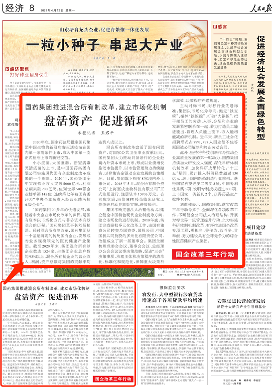 小小疫苗,大國重器。新冠病毒滅活疫苗的上市,是中國醫(yī)藥集團(tuán)有限公司實(shí)施現(xiàn)代國有企業(yè)制度改革成果的一個(gè)縮影。2020年,國藥集團(tuán)全年實(shí)現(xiàn)營業(yè)收入突破5000億元,利潤總額突破200億元,位列世界500強(qiáng)企業(yè)榜單第145位,連續(xù)第七年被國資委評為“中央企業(yè)負(fù)責(zé)人經(jīng)營業(yè)績考核A級企業(yè)”。