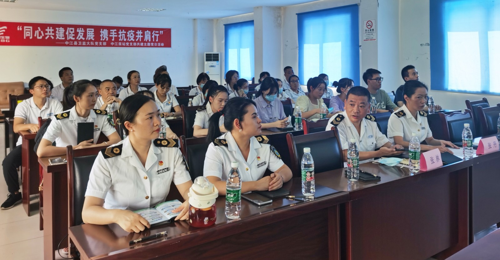 近日,中江漿站黨支部與中江縣衛(wèi)監(jiān)大隊黨支部聯(lián)合開展“同心共建促發(fā)展 攜手抗疫并肩行”主題黨日活動。雙方黨員、入黨積極分子、漿站班子成員及員工代表30余人參加活動。