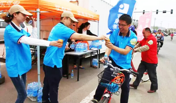 隨著騎行指令的發(fā)出,醫(yī)貿(mào)公司方陣有序進(jìn)入賽道,每一輛自行車上插有帶企業(yè)logo的旗幟,如同一股藍(lán)色的溪流涌入騎行路線。為保障騎行秩序、確保人員安全,特成立后勤小組,現(xiàn)場(chǎng)為運(yùn)動(dòng)員分發(fā)水和食物。